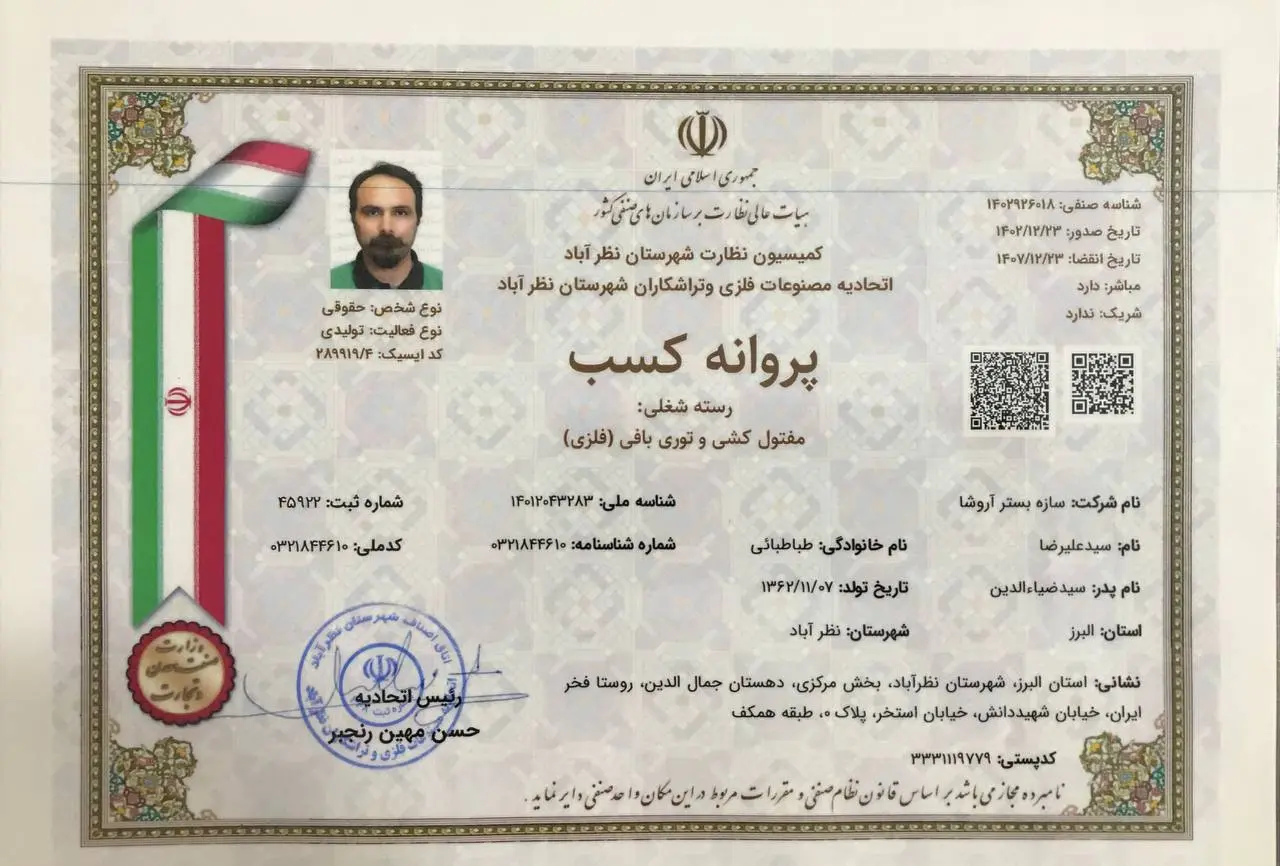 این پروانه توسط کمیسیون نظارت شهرستان نظرآباد و اتحادیه مصنوعات فلزی و تراشکاران صادر شده و نشاندهنده فعالیت قانونی، تولیدی و معتبر این مجموعه میباشد.